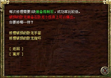 携带这些来找卧龙隐士,选择[ 修理破损卧龙装备 ]这个选项可以进行修理。