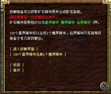点击“卧龙隐士”进入[ 拆解精华 ]界面可以通过拆解装备获取精华矿石。